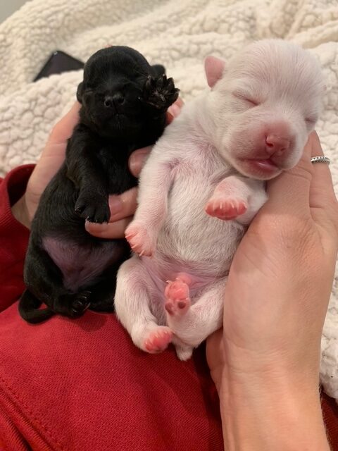 Olive and Wilbur were born on my sister’s pillow! We took in a doggie not knowing she was pregnant. Soon after, she gave birth and we welcomed these two little angels into the world! Both are happy doggies in their homes now!