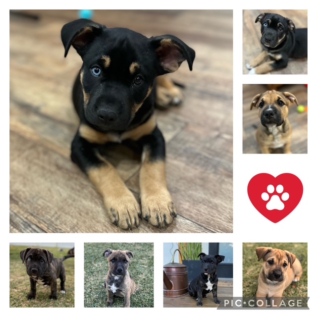We call this the box litter because unfortunately, some horrible people put these 7 puppies in a box and dumped them on a freeway off ramp. They were only 3 weeks old. Our wonderful fosters had to bottle feed some of them as they were right at the transition phase getting introduced to wet food. At only a few pounds when we got them, these puppies turned out to be very chunky and weighing upwards of 80 pounds! All now in happy homes!