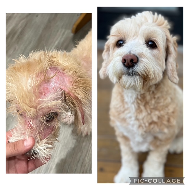 Look at this transformation! Papaya was found as a stray with the worst skin infection I have ever seen! Her finders wanted to keep her, but after weeks of trying to help her skin they could no longer financially or physically take care of her. We took her in and spent many weeks trying to heal her skin. She went from bald, to wirey hair, to these luscious locks! Papaya is a very loved little doggie in her new home!